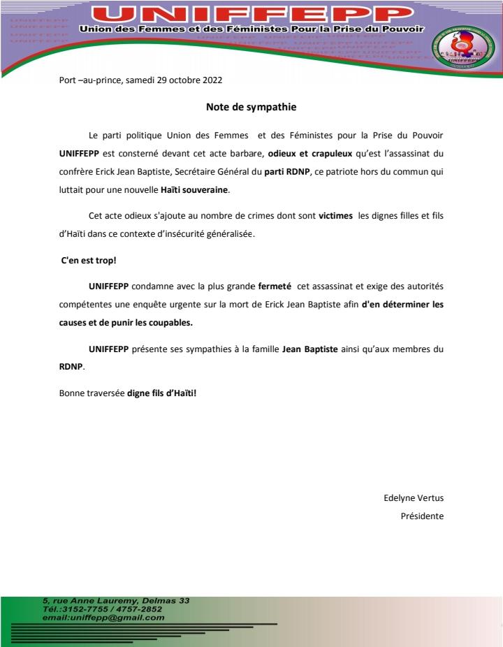 L’Union des Femmes et des Féministes pour la Prise du Pouvoir (UNIFFEPP) condamne avec la plus grande rigueur l’assassinat du secrétaire général du RDNP, Eric Jean-Baptiste. Dans une note rendue publique le samedi 29 octobre dernier, cette structure exige une enquête du côté des autorités compétentes pour que lumière soit faite.