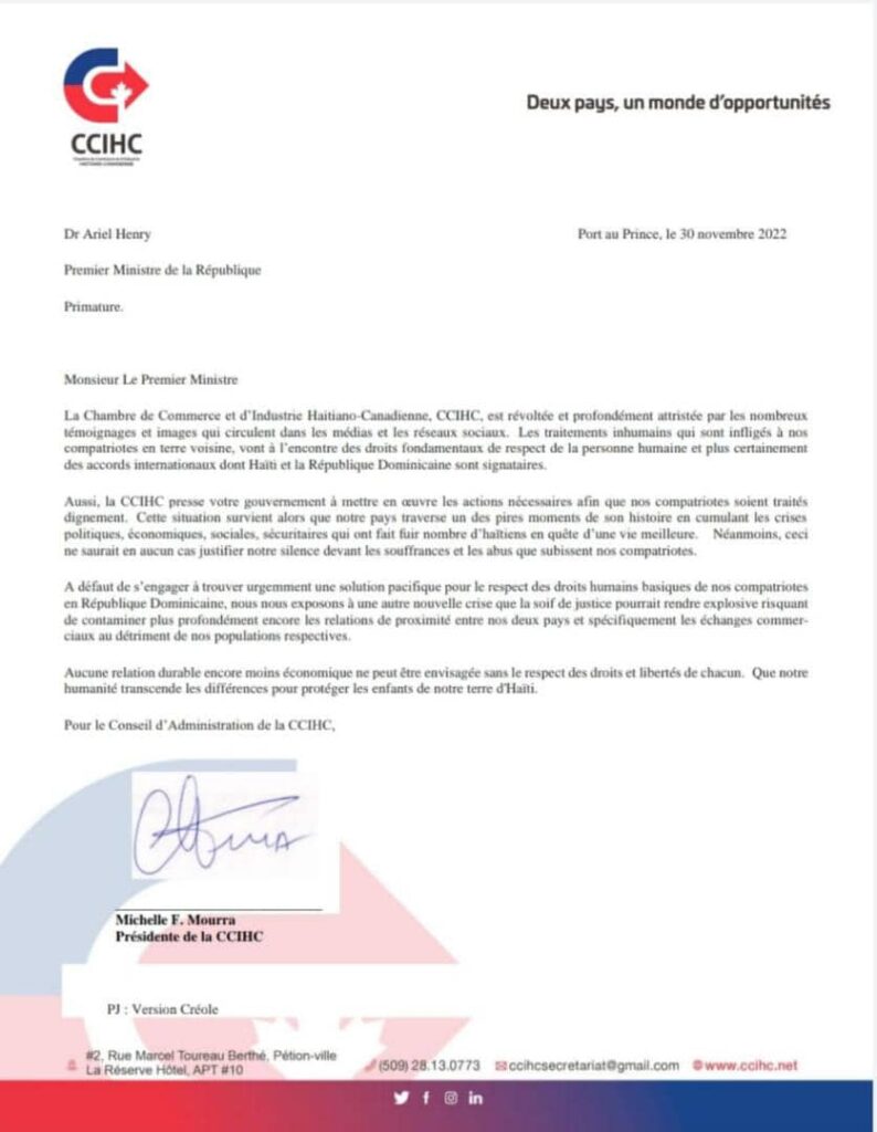 Dans cette lettre portant la signature de la présidente de la Chambre de Commerce et d’Industrie Haitiano-Canadienne, madame Michelle F. Mourra, elle affirme qu’aucune relation durable encore moins économique ne peut être envisagée sans le respect des droits et libertés de chacun.