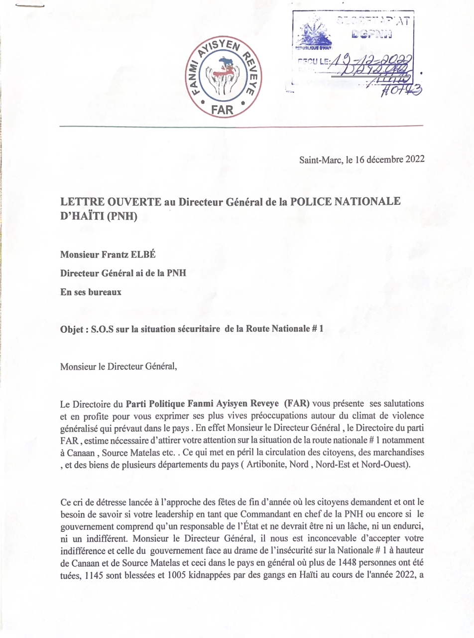 Dans cette lettre ouverte au Directeur Général de la Police Nationale d’Haïti (PNH), Frantz Elbé, le parti politique Fanmi Ayisyen Reveye (FAR) dit exprimer ses plus vives préoccupations quant au climat de violence généralisé qui prévaut dans le pays. Cette formation politique, dans cette lettre publique, a attiré l’attention du Chef de la PNH sur la situation de la route Nationale #1 au niveau de Canaan et de Source Matelas qui met en péril la circulation des citoyens des marchandises et des biens de plusieurs départements du pays dont l’Artibonite, le Nord, le Nord-Est et le Nord-Ouest.